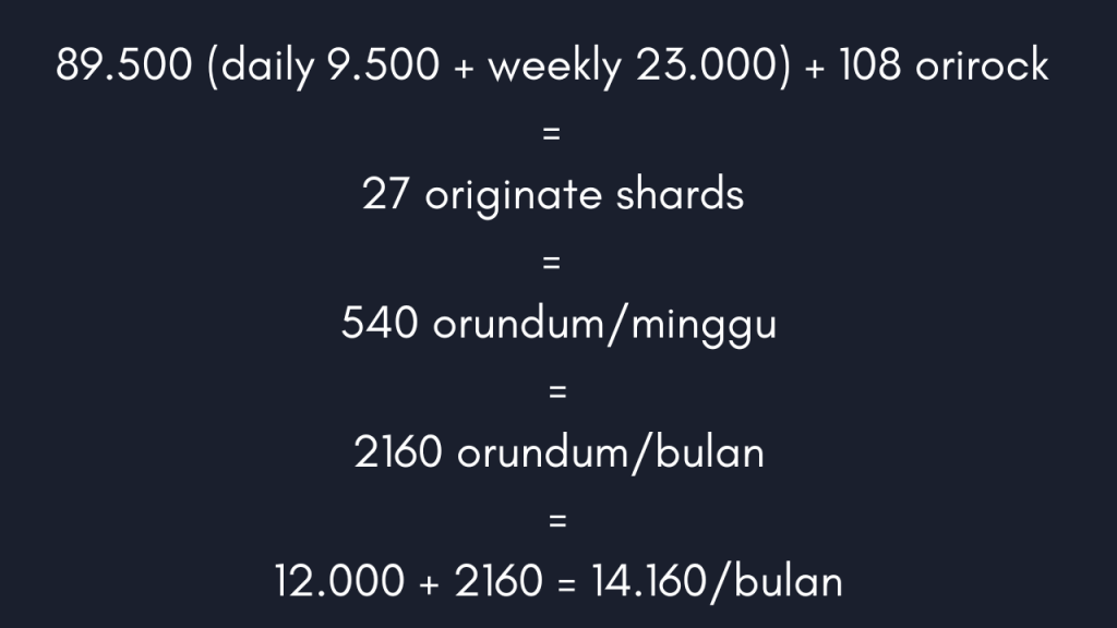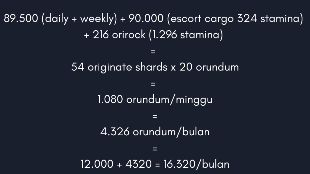 108 orirock (stamina 648/minggu) + 89.500 lmd (dari quest) = 27 originate shards lalu dikali 20 orundum maka jadi 540 orundum/minggu = 2160/bulan.